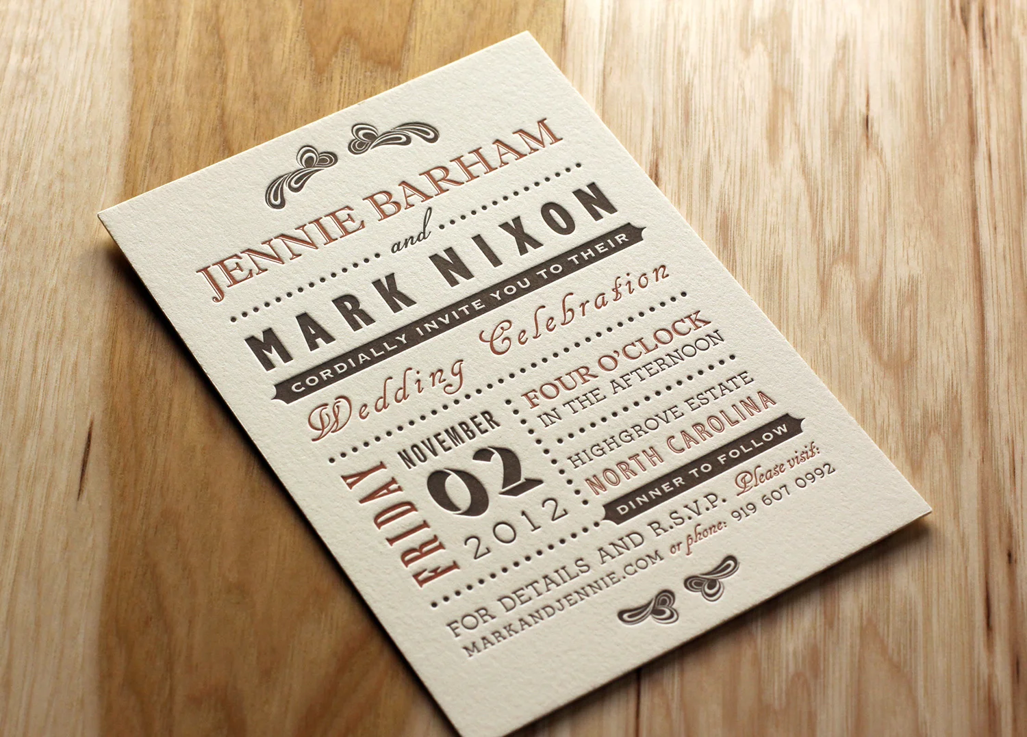 Jennie and Mark found the perfect necktie for him to wear at their autumn wedding — the pattern was a stylized paisley in orange and brown, with some lilac. That purchase turned into the inspiration for their wedding invitation. They loved letterpress, and after searching a bit for a good, independent printer, they found Parklife Press.