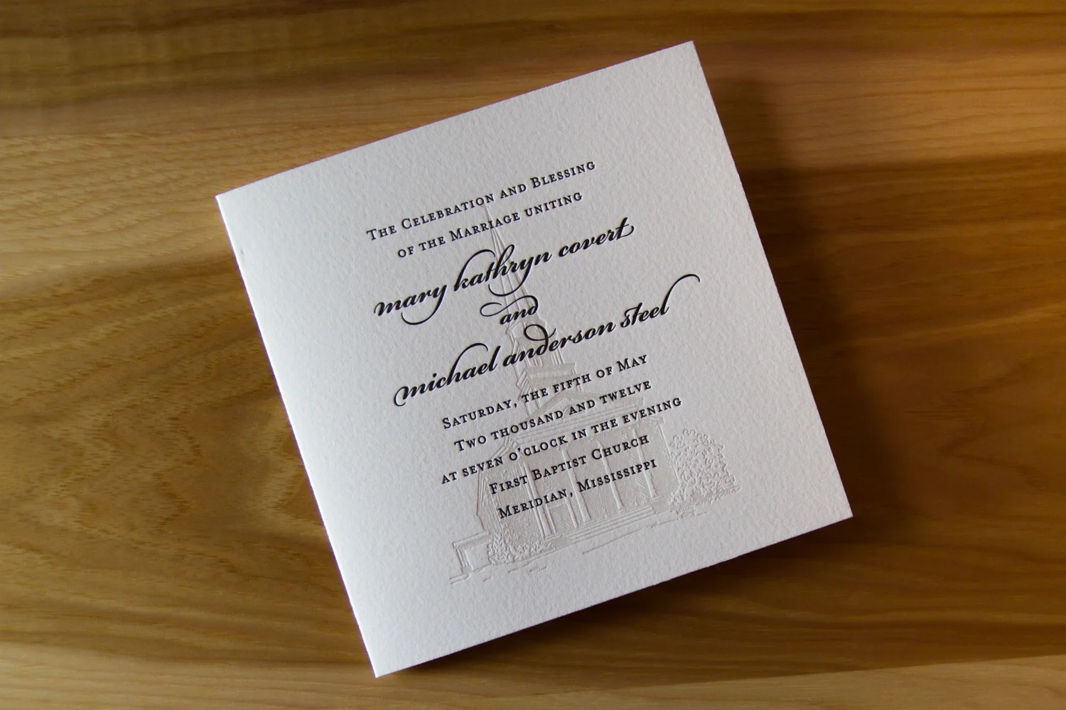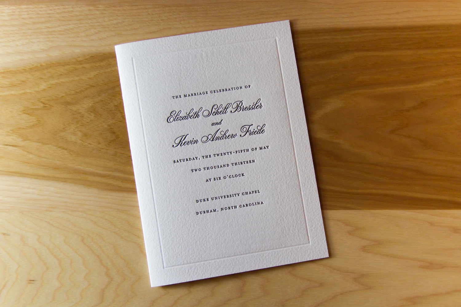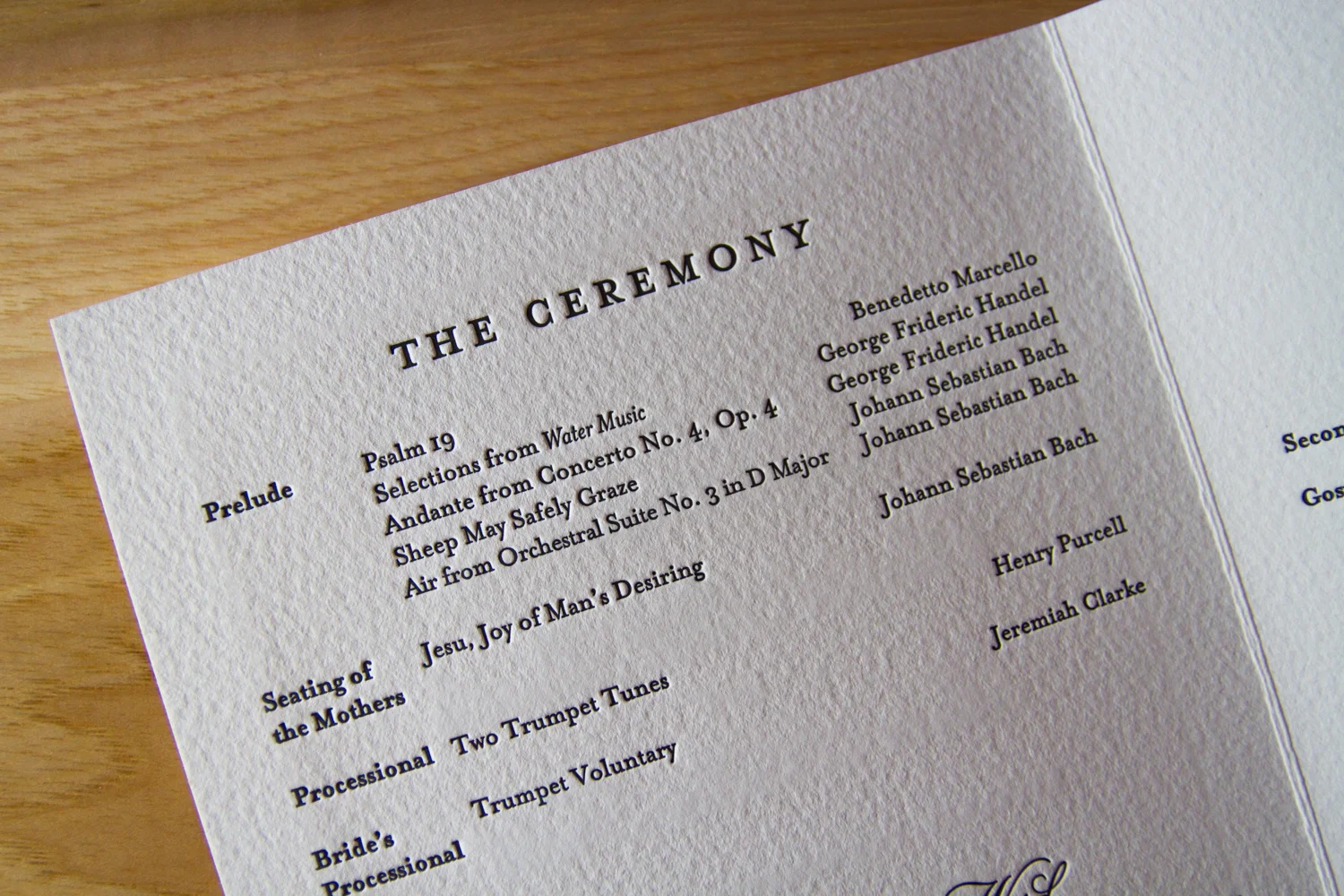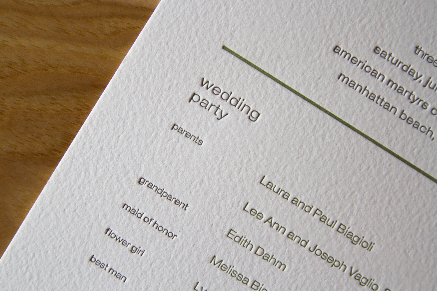 Tip: in listing the wedding party, you only really need each person’s name. But if you have the space and inclination, it’s extra nice to include some context, like “sister of the groom,” or “godchild of the bride,” or “friend of couple.” It goes a long way to helping your guests understand the emotional connections between all the key players. (“Oh, look! Isn’t that nice? The ‘best woman’ is the groom’s sister, and the ‘man of honor’ is the bride’s brother!” and “Oh, look, the bride will be accompanied down the aisle by both her parents!”)