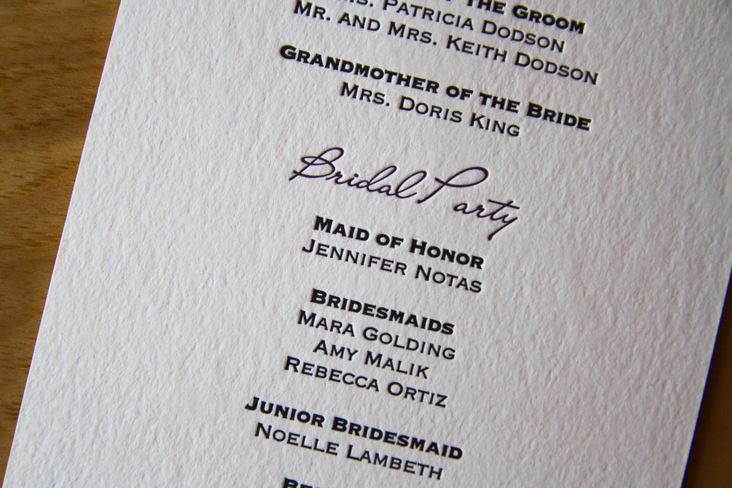 And who are all those guys standing up there with the bride and groom? Siblings? Soccer teammates? Sorority sisters and frat brothers? Co-workers? All of the above? Listing the wedding party in the program is not only a way to honor and thank those participants, but it’s also thoughtful information to provide to the guests.
