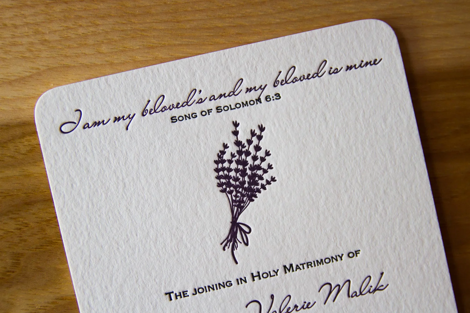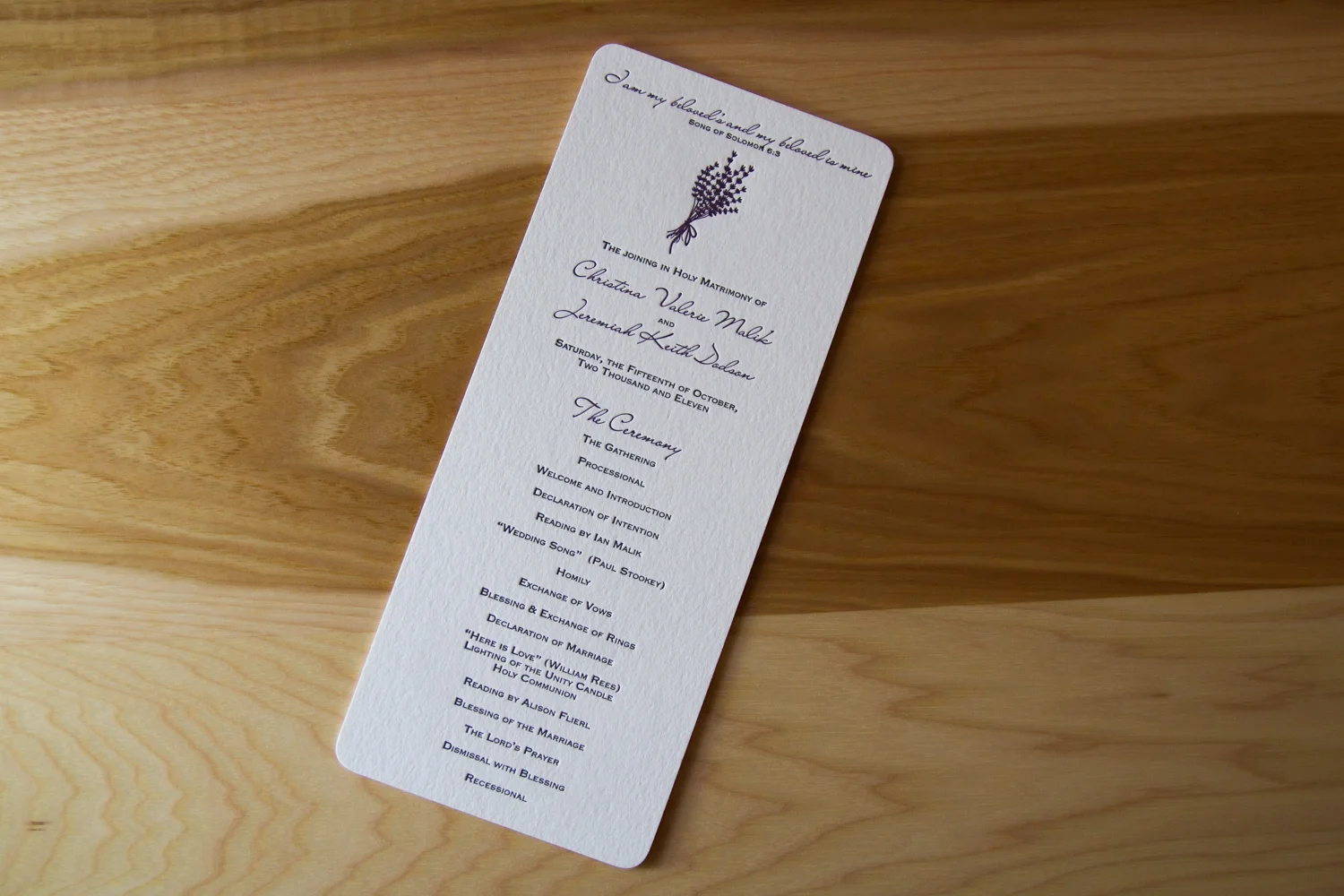 Some other elements that can be included: a passage or quote which is meaningful to the couple can really set the tone of the ceremony (above, a line of scripture is paired with a sprig of lavender, carrying through the colors and motif of the wedding). Another extra: if the couple has a new address, the program can be a great place to share it officially with their guests — either on the back, or as a note at the end.