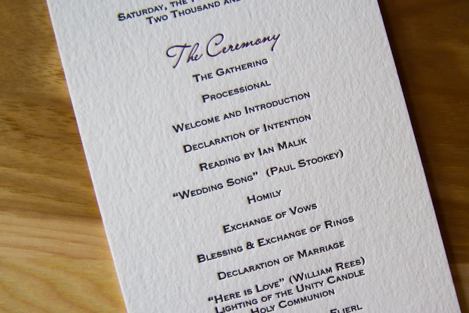 When writing your program, think of the audience. For most weddings, the guest list is comprised of a wide range of acquaintances, running the gamut from “oldest dearest friend” to “the cousin/childhood playmate whom you haven’t seen in years” to “husband of a woman who works with your dad.” You write the program so that it addresses everyone, so each guest can follow along regardless of how well they know the couple.