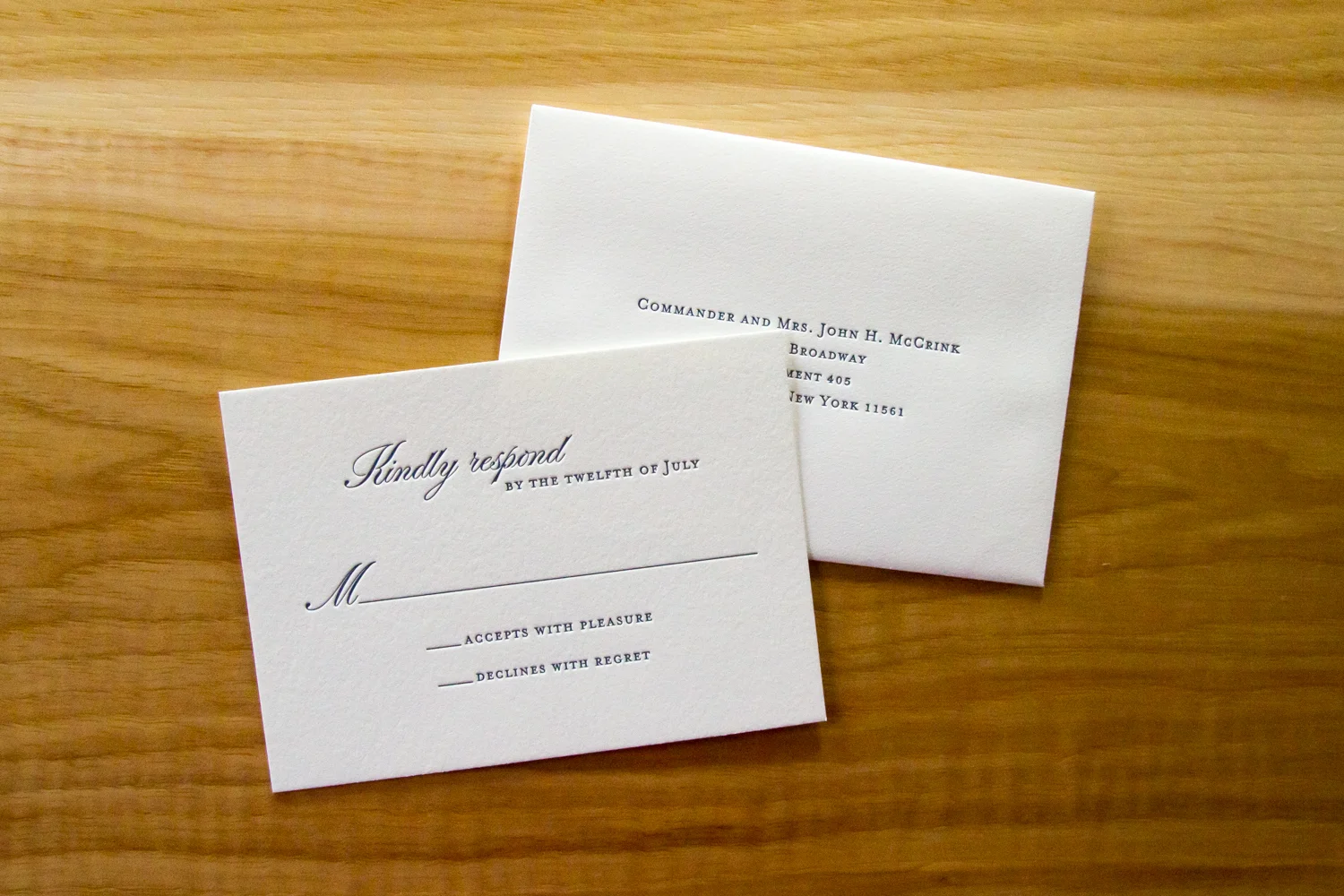 The corresponding response cardand printed return envelope set — text only, without accent art or color — is simple and traditional.