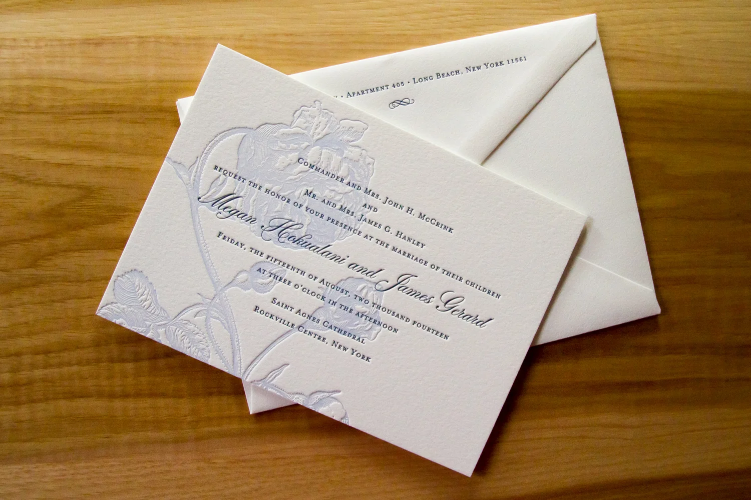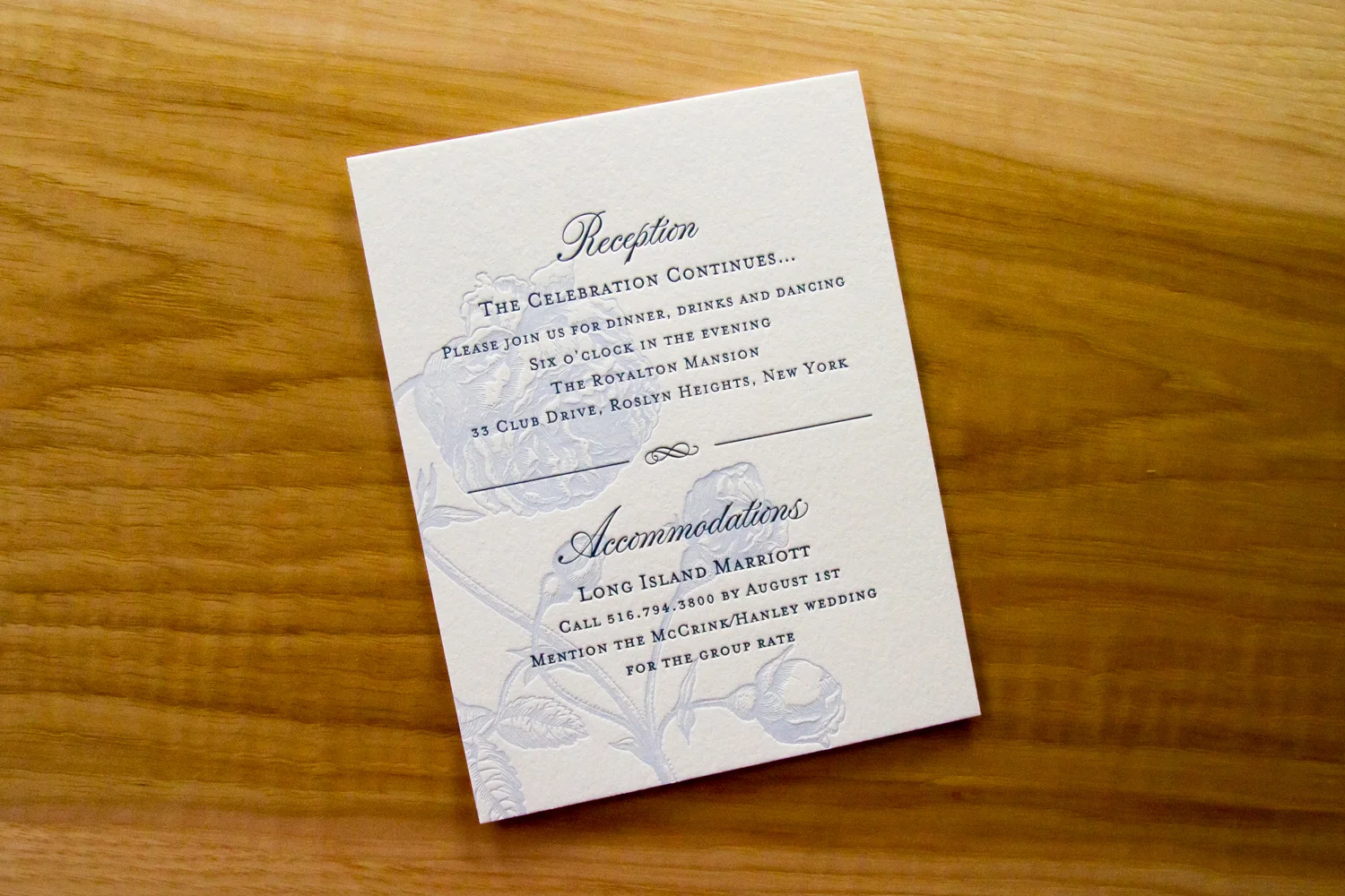 This was a set based on the Franklin design. Printed on 600g Pearl White stock in Marine and Periwinkle inks, the design has striking text printed over a delicate, floral background. The invitation, along with a reception card, RSVP card and envelope, were held together within the outer envelope by a monogrammed belly band in the lighter blue accent color.