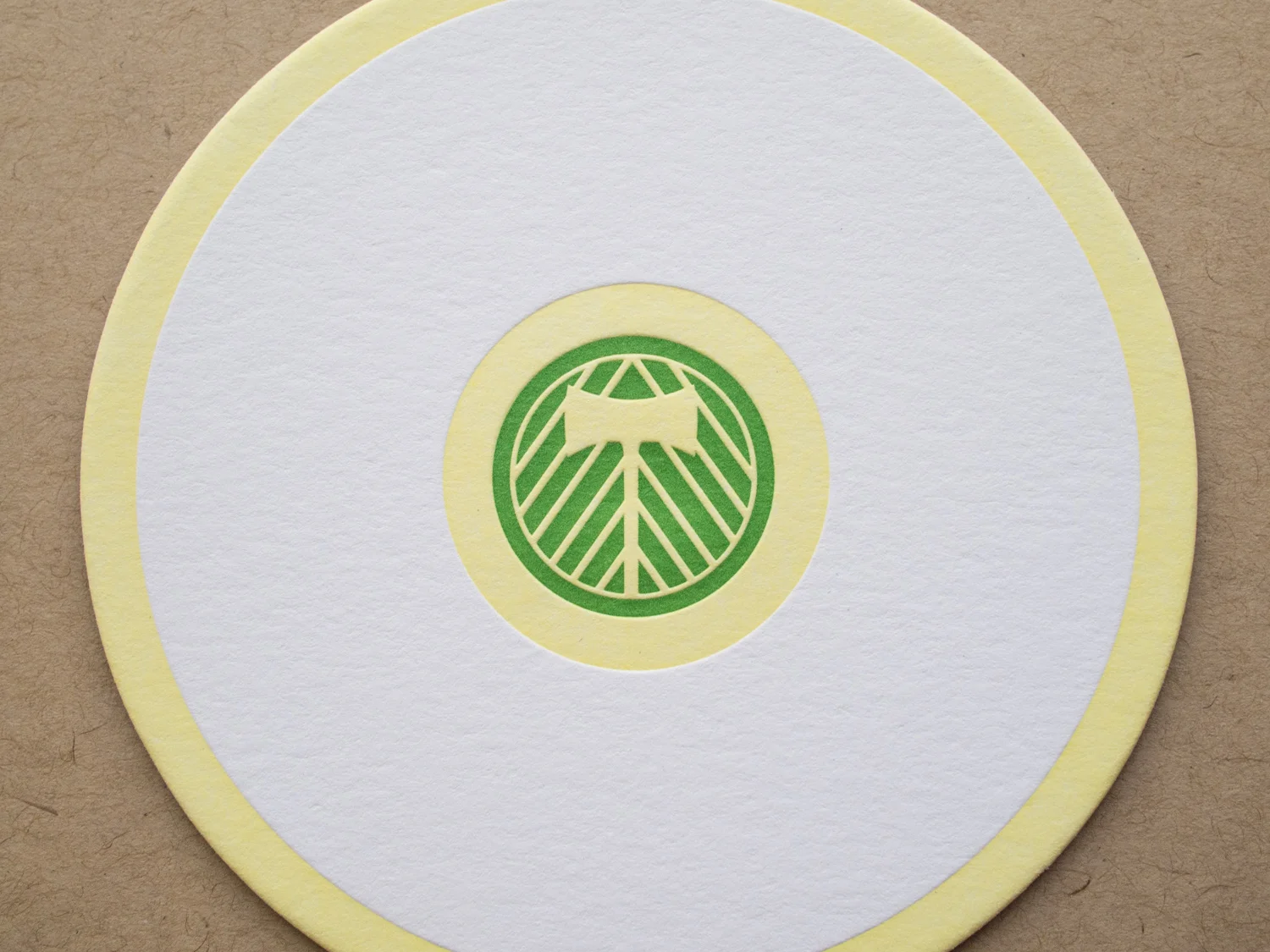 We printed the Timbers side with two inks on 300g Fluorescent White Lettra. On the opposite side, we printed a modified Trail Blazers logo with silver and red inks on ridiculously thick 4-ply rich black museum board. Then we duplexed the two sheets by hand and die cut them to 4 inch 80pt thick circles.