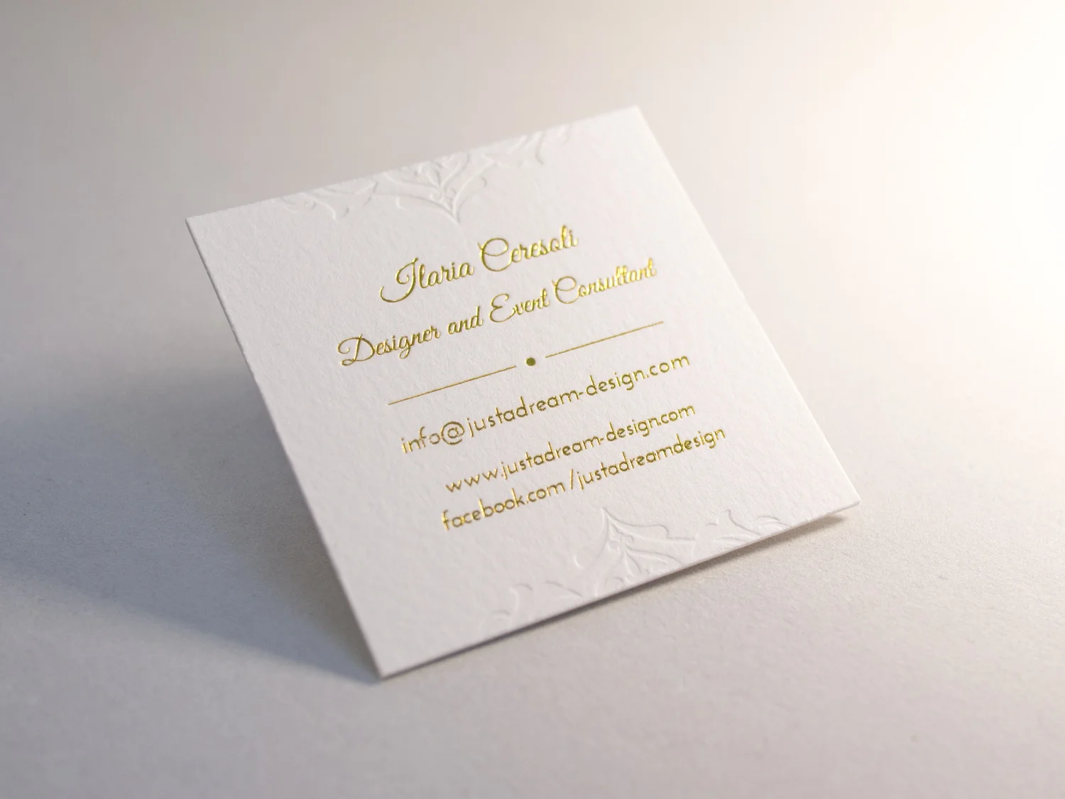 For designer and event consultant, Ilaria Ceresoli and her business Just a Dream, we printed these super-deluxe foil + letterpress business cards on 100% cotton Somerset paper.
