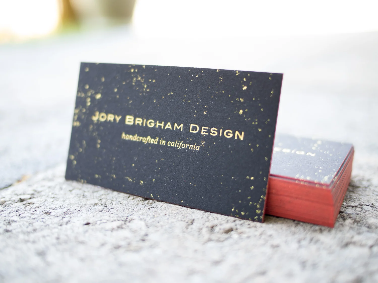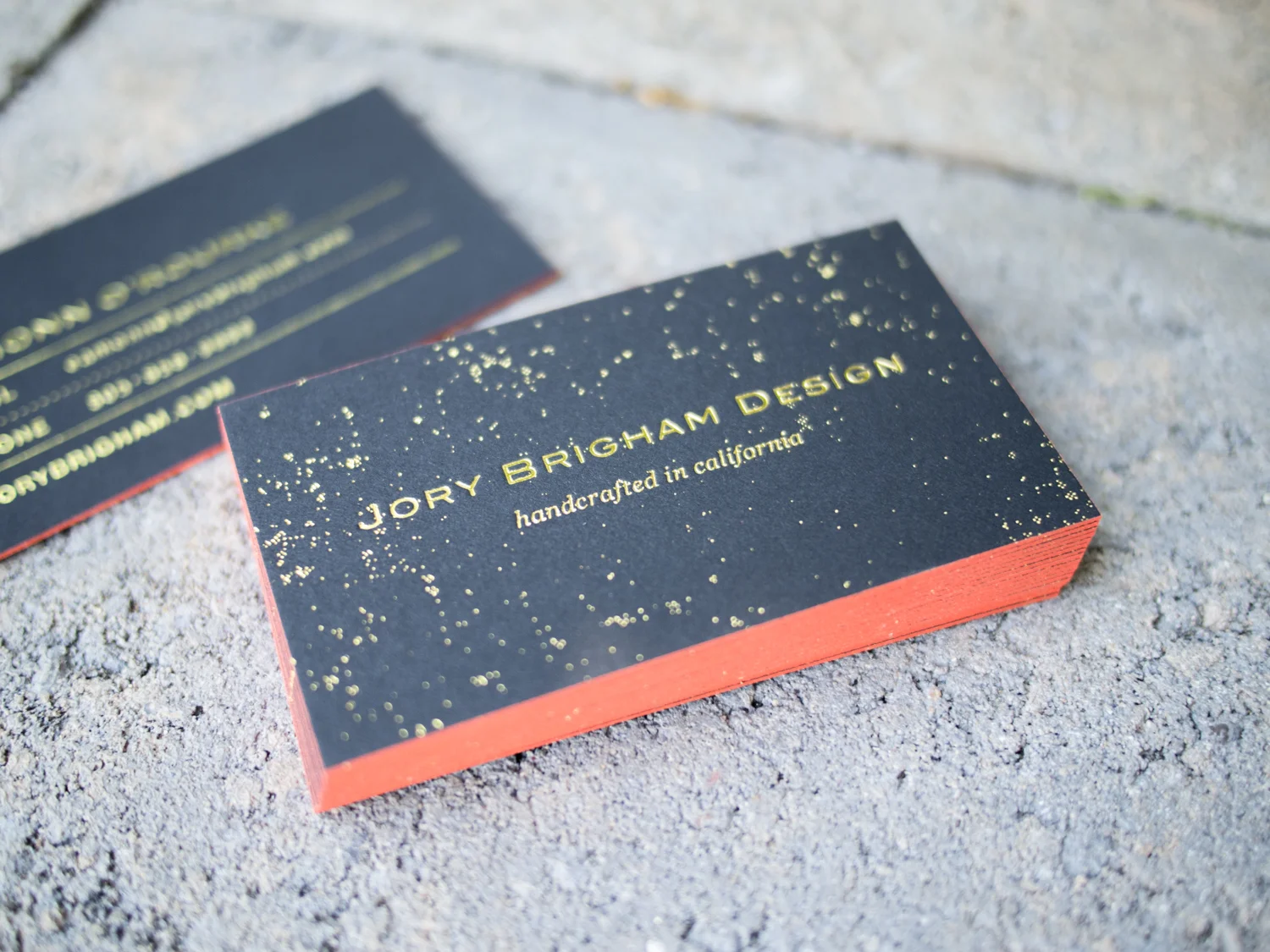 A few months later, Jory game to us for business cards. We again went with a gold-on-black look, but this time with thinner 2-ply museum board and metallic gold foil. We finished the cards with a rich orange edge paint.