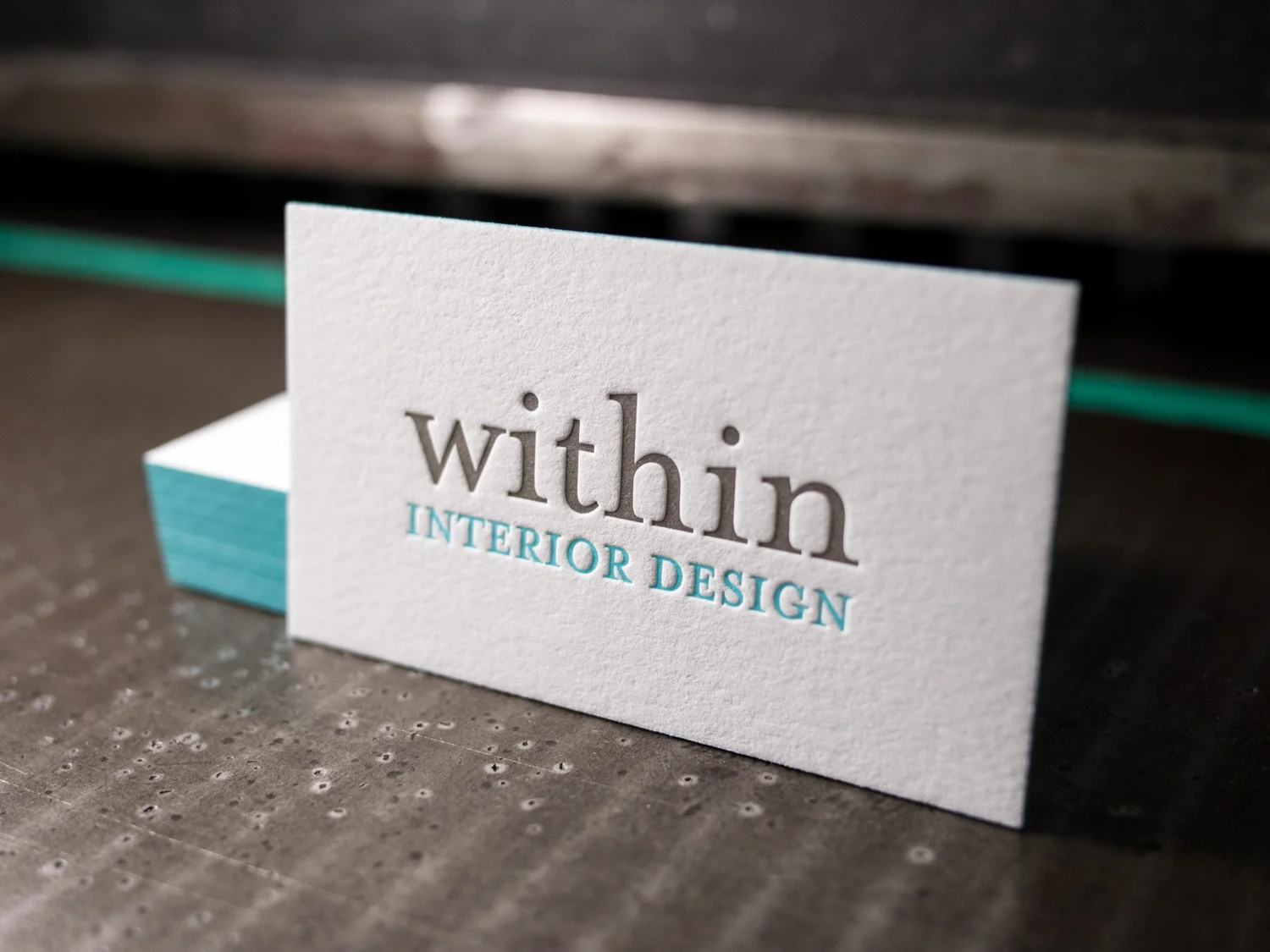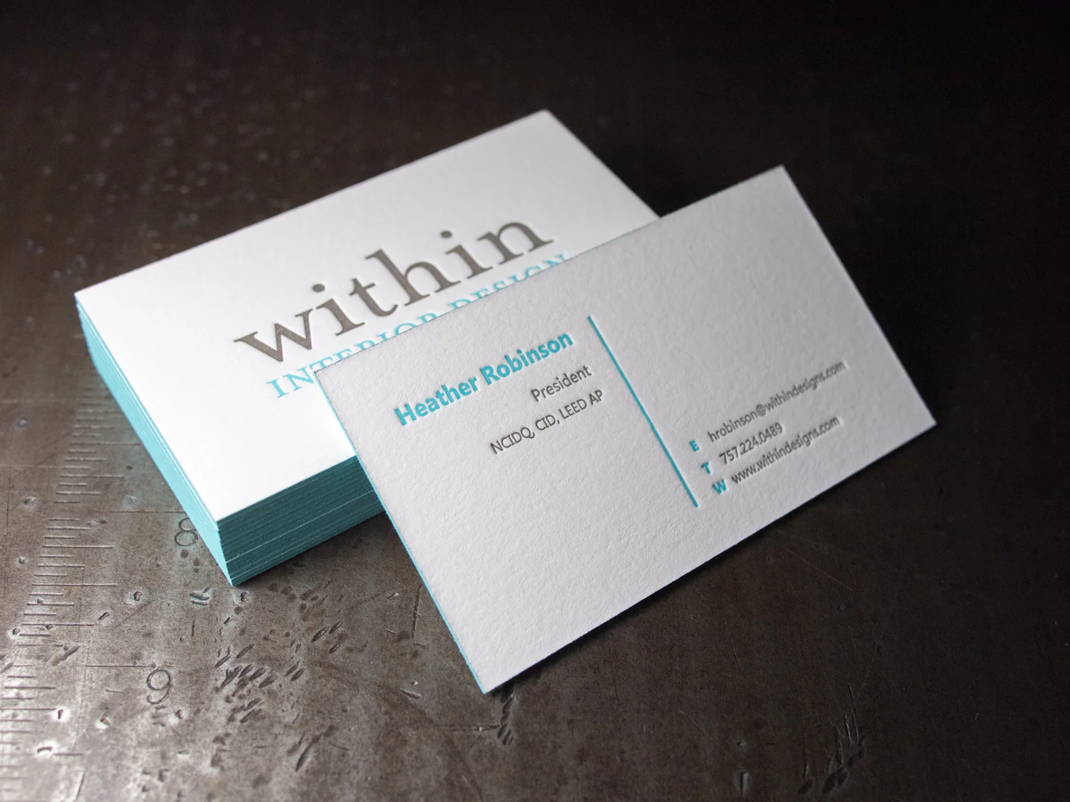 Check out these beautifully understated two-color, two-sided cards for Norfolk’s Within Interior Design. For each of the eight women at the firm, we printed turquoise and warm gray inks on thick 600g Fluorescent White Lettra and added turquoise edge paint to match.