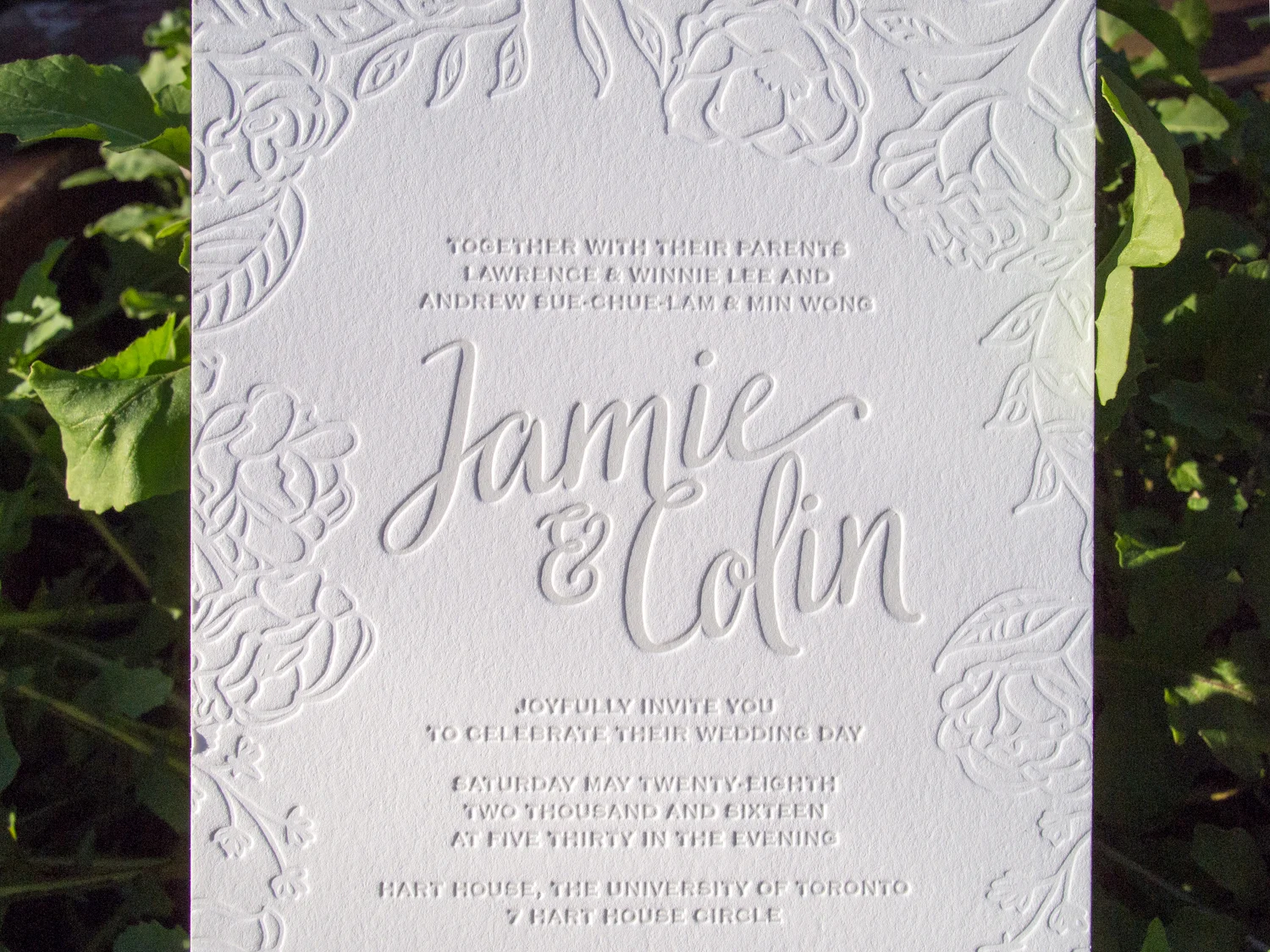 We printed these oversized invites for the friendly folks at Frou Frou House with a very light cool gray ink and a deep blind impression. They’re printed on our 600g Fluorescent White stock sized for large A9 envelopes.