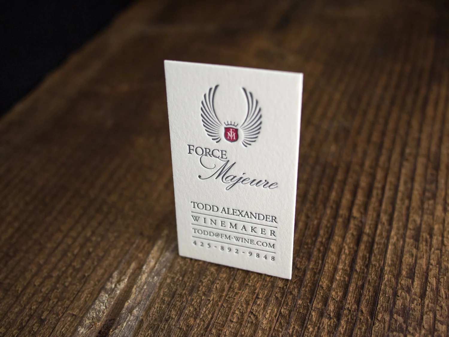 Washington wine-makers and friends of Parklife, Force Majeure, have some new cards. This time we went thicker, bolder, and more tightly-registered (check out the precisely-placed scarlet ink inside the gray knockout). These are printed on our Ecru 600g Lettra paper.