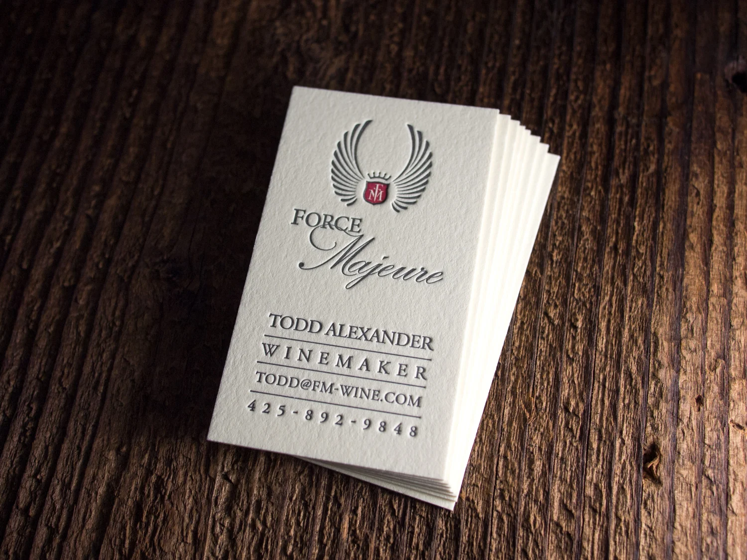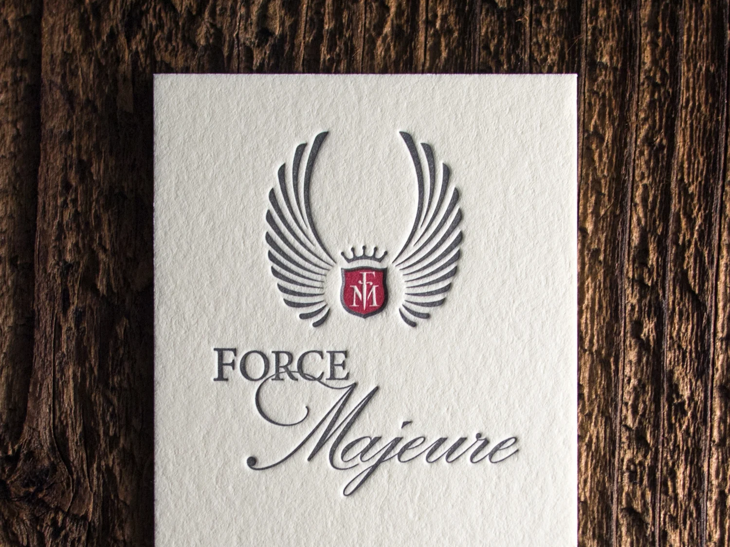 Washington wine-makers and friends of Parklife, Force Majeure, have some new cards. This time we went thicker, bolder, and more tightly-registered (check out the precisely-placed scarlet ink inside the gray knockout). These are printed on our Ecru 600g Lettra paper.