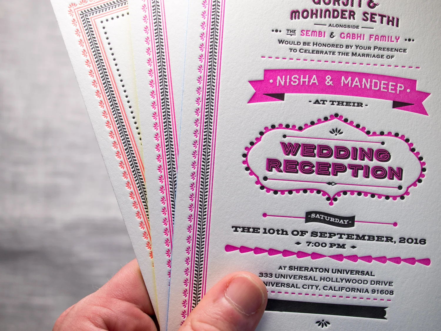 All three have a common feel — employing the same border art, black ink, and copperplate type. But Nisha used different title art for each and we printed them with three different fluorescent letterpress inks — neon orange, deep magenta, a bright pink. We finished each set with three different edge paints — electric blue, highlighter yellow, and metallic silver.