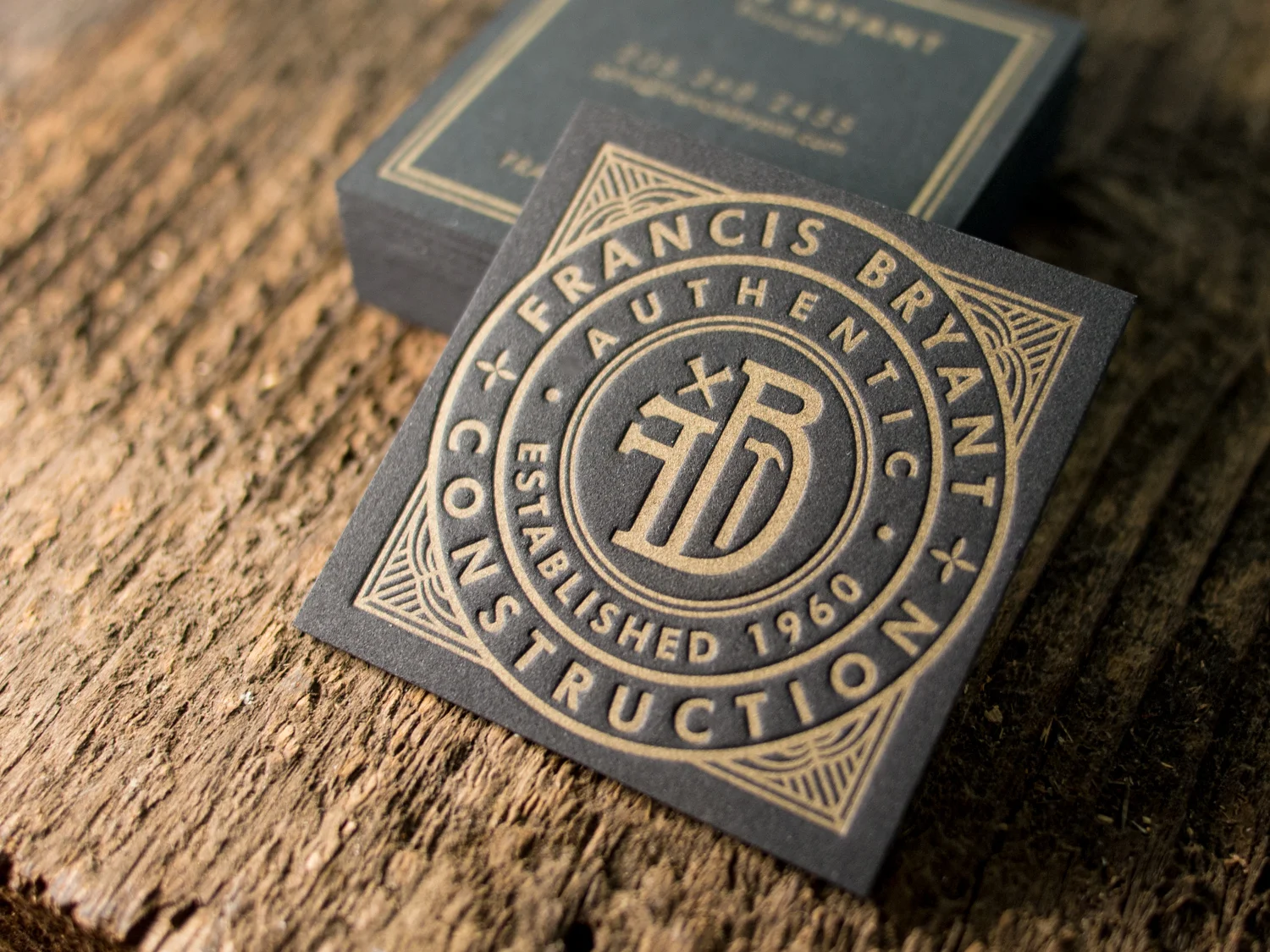 Wonderful logo design by The G Brand. Printed on both sides with gold ink on 60pt black museum board.