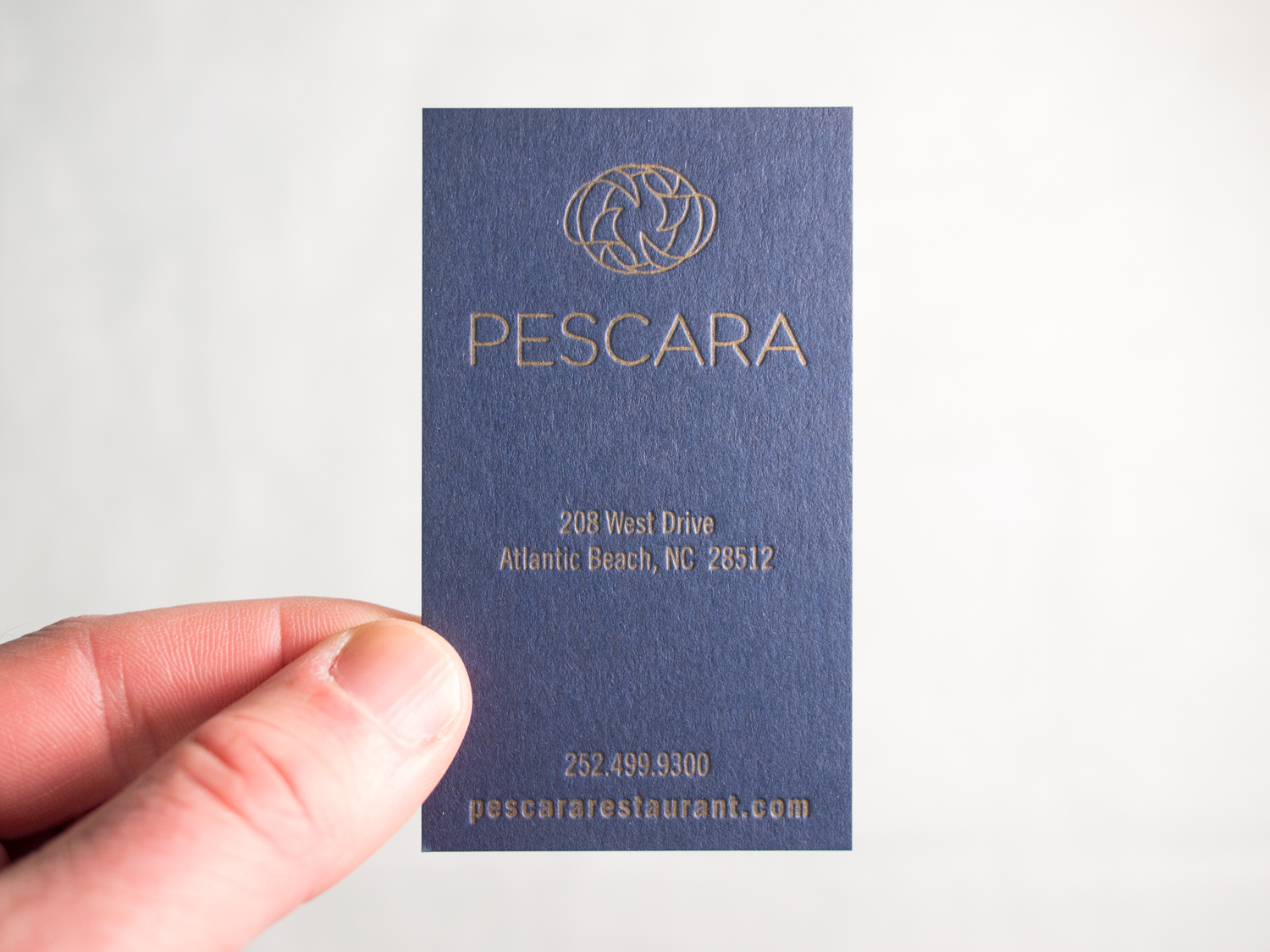 Simple one-color cards on thick 540g Colorplan paper for the Atlantic Beach restaurant, Pescara. Metallic letterpress inks show just a hint of shimmer, and unlike most inks, they’re opaque so they look great on dark papers.